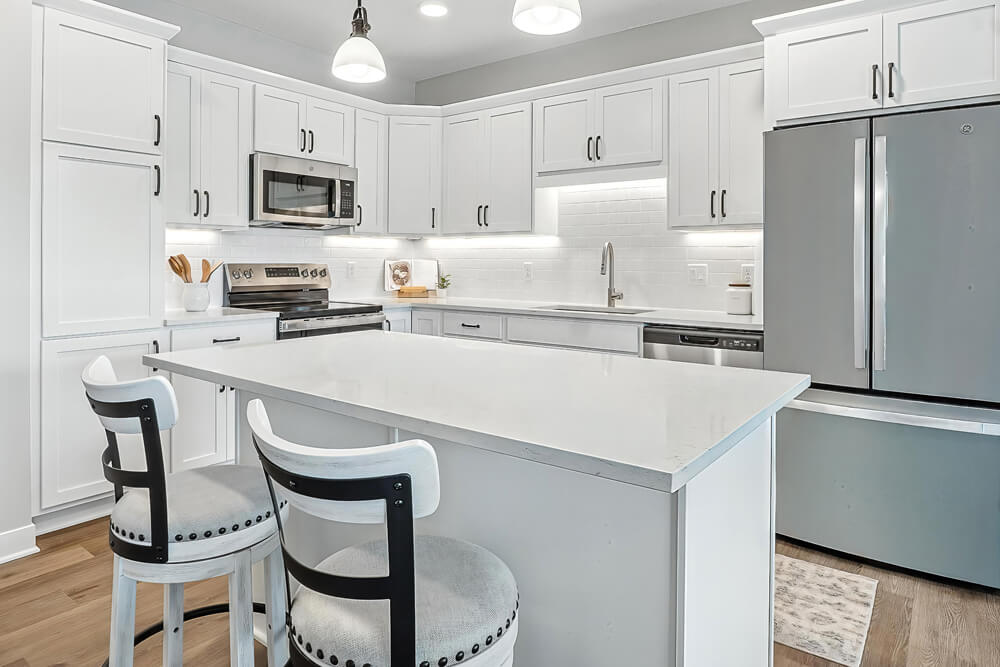 • Kitchen island*, stainless-steel appliances, quartz countertops, under cabinet lighting, soft-close drawers and tiled backsplash